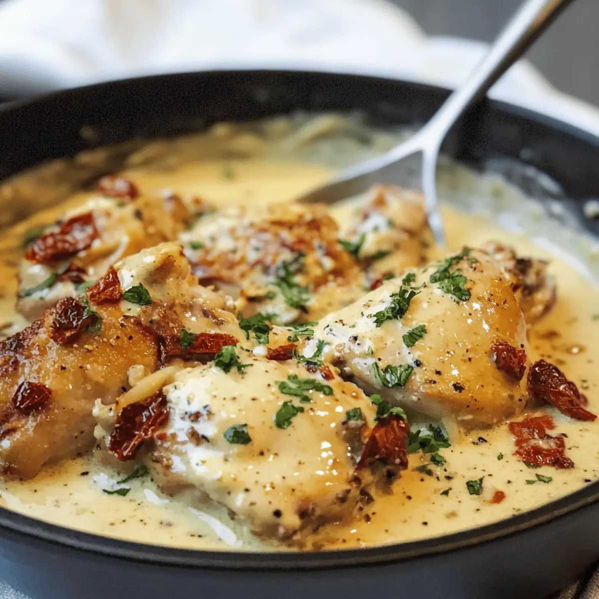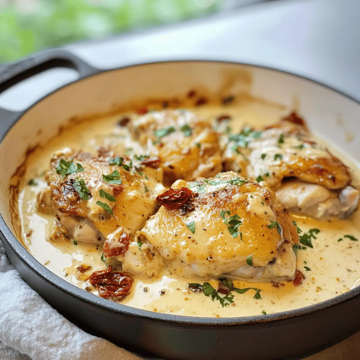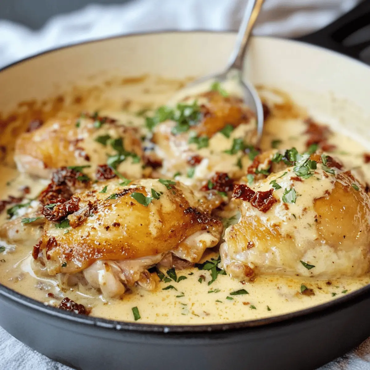 Cuisses de poulet crémeuses à l’ail faciles et rapides Posted on October 23, 2025October 23, 2025 by Juliette Mercier Quand le crépitement d’une poêle chaude commence à remplir la cuisine, on sait qu’un délicieux repas est en train de prendre forme. Vous allez adorer cette recette des cuisses de poulet crémeuses à l’ail, parfaite pour une soirée chargée. En un rien de temps, vous obtiendrez un plat réconfortant et savoureux, préparé avec des ingrédients simples mais efficaces. Avec sa sauce riche à base de crème et de tomates séchées, cette recette ne seulement ravira vos papilles, mais elle est également une option de dîner rapide et sans gluten. Que vous soyez un chef chevronné ou un amateur curieux, cette recette se plie à vos besoins, avec des variations pour ceux qui préfèrent une alternative low carb. Quel accompagnement envisagez-vous pour sublimer ce festin? Pourquoi adorer les cuisses de poulet crémeuses? Simplicité : Même si vous êtes novice en cuisine, cette recette facile et rapide vous permettra de préparer un plat savoureux en un rien de temps. Saveurs riches : L’alliance entre la crème et les tomates séchées à l’ail crée une sauce onctueuse qui enchantera vos invités. Polyvalence : Que vous souhaitiez accompagner ce plat de riz, de pâtes ou même de légumes rôtis, vous trouverez de nombreuses options pour l’adapter à vos goûts. Économie de temps : Avec des temps de préparation minimal et une cuisson rapide, ce repas se prépare aisément après une longue journée de travail. Choix sains : Les cuisses de poulet sont une source de protéines délicieuse, et avec l’option de les servir avec du riz de chou-fleur, cet plat devient non seulement indulgent mais aussi compatible avec vos objectifs de santé. N’oubliez pas de découvrir d’autres idées de variation en fonction de vos envies en visitant notre section sur les recettes adaptées comme le riz de chou-fleur. Ingrédients des cuisses de poulet crémeuses à l’ail • Cette recette simple nécessite des ingrédients que vous avez peut-être déjà dans votre cuisine. Pour la viande Cuisses de poulet (désossées et sans peau) – La base savoureuse du plat, offrant de la jutosité. Choisissez des cuisses avec os pour plus de saveur si cela vous tente. Pour la sauce Huile de tomate séchée – Apporte une profondeur salée et acidulée. Vous pouvez la remplacer par de l’huile d’olive si besoin. Crème – Donne à la sauce sa texture crémeuse. La crème épaisse ou la crème de cuisson fonctionnent le mieux, évitez la crème fouettée. Vin blanc sec – Équilibre le tout, ajoutant complexité et acidité. Un vin comme le Pinot Gris est recommandé pour ce plat. Ail (pelé) – Infuse la sauce d’une riche saveur d’ail. Ajustez la quantité selon vos goûts pour l’ail. Flocons d’oignon séchés – Ajoute une note d’oignon sans les tracas de couper des oignons frais. À sauter si non désiré. Herbes italiennes – Apportent une saveur aromatique. Substituez par du persil séché, de l’origan ou du basilic au besoin. Tomates séchées – Offrent une saveur concentrée et sucrée. Utilisez des tomates séchées fermes, évitez les variétés semi-séchées. Sel casher et poivre noir – Rehaussent les saveurs naturelles du poulet. Ajustez selon votre goût. Pour présentation Garniture (facultatif) – Persil frais haché et poivre noir pour un peu de couleur supplémentaire lors du service. Avec ces ingrédients en main, vous êtes prêt à préparer de délicieuses cuisses de poulet crémeuses à l’ail qui apporteront chaleur et réconfort à votre table ! Instructions pour les cuisses de poulet crémeuses à l’ail Step 1: Préparer le poulet Chauffez l’huile de tomate séchée dans une grande poêle à feu vif. Pendant que l’huile chauffe, assaisonnez les cuisses de poulet avec du sel, du poivre et des herbes italiennes. Une fois l’huile bien chaude, déposez le poulet dans la poêle et faites-le dorer pendant 4 à 5 minutes de chaque côté. Retirez-le ensuite dans un bol tapissé de papier absorbant pour enlever l’excès d’huile. Step 2: Préparer la sauce Dans la même poêle, ajoutez le vin blanc et laissez-le mijoter pendant 1 à 2 minutes pour évaporer l’alcool. Ajoutez ensuite la crème et les flocons d’oignon séchés. Remuez bien le tout avec une spatule en bois pour obtenir un mélange homogène, et laissez la sauce chauffer à feu moyen pendant environ 3 à 4 minutes jusqu’à ce qu’elle commence à épaissir légèrement. Step 3: Ajouter les saveurs Incorporez les tomates séchées et l’ail pelé dans la sauce. Laissez cuire pendant 2 à 3 minutes supplémentaires, en remuant régulièrement, jusqu’à ce que l’ail devienne tendre et que ses arômes se libèrent. La sauce doit être riche et crémeuse, prête à envelopper les cuisses de poulet crémeuses à l’ail. Step 4: Combiner le poulet et la sauce Réintroduisez les cuisses de poulet dorées dans la poêle, puis réduisez le feu à moyen-doux. Couvrez la poêle et laissez mijoter le tout pendant 10 minutes. Le poulet doit atteindre une température interne de 74-77°C (165-170°F) et être parfaitement cuit, tandis que l’ail devient encore plus savoureux. Step 5: Servir Une fois le poulet bien cuit, répartissez-le avec une généreuse portion de sauce dans des assiettes. Servez les cuisses de poulet crémeuses à l’ail chaudes, accompagnées de riz ou de légumes vapeur. N’hésitez pas à garnir de persil frais haché et d’un peu de poivre noir pour une touche finale élégante. Que servir avec des cuisses de poulet crémeuses à l’ail? Quand il s’agit de parfaire un repas autour de ces cuisses de poulet crémeuses à l’ail, les options d’accompagnement se révèlent infinies et délicieuses. Riz basmati : Léger et parfumé, idéal pour absorber la sauce crémeuse et équilibrer les saveurs riches. Légumes rôtis : Des lég