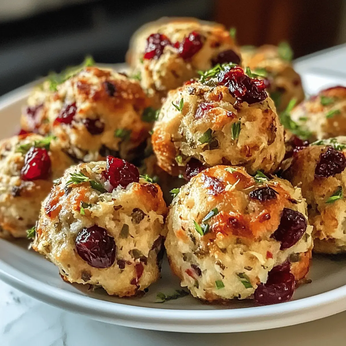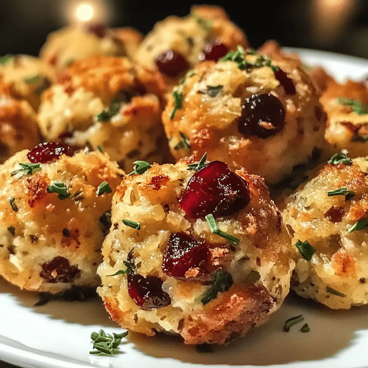 Jump to Recipe Print RecipeLors d’une récente fête, j’ai été charmé par un mélange irrésistible de saveurs et d’odeurs dans la cuisine. Les Boulettes de farce au dinde et aux canneberges sont enfin à portée de main pour épater vos invités ! Avec leur préparation rapide de seulement 40 minutes, ces petites merveilles sont parfaites pour agrémenter vos repas festifs ou vos réunions en famille. Non seulement elles sont polyvalentes – pouvant servir d’entrée ou d’accompagnement – mais elles apportent également une touche nutritive à votre table. À la fois tendre, savoureuse et légèrement sucrée grâce aux canneberges, cette recette deviendra certainement un des plats préférés de vos convives. Et vous, êtes-vous prêt à découvrir comment réaliser cette délicatesse ? Pourquoi essayer ces boulettes de farce ? Savoureux mélange : L’association de la dinde juteuse et des canneberges sucrées crée une explosion de saveurs qui ravira vos papilles. Facilité de préparation : Avec seulement 40 minutes de préparation, même les débutants en cuisine peuvent réussir ce plat sans tracas. Polyvalentes : Que ce soit comme entrée ou en accompagnement, ces boulettes s’adaptent à de nombreuses occasions. Épicées à souhait : Dotez-les des herbes de votre choix, comme le thym ou le romarin, pour personnaliser leur goût. Un succès assuré : Ces boulettes séduiront à coup sûr vos invités, devenant le plat vedette de vos repas festifs, tout comme ces délicieuses Boulettes Courgettes Feta ou la savoureuse Tarte Aux Pommes. Ingrédients pour les Boulettes de Farce au Dinde et aux Canneberges • Préparez-vous à un festin délicieux avec ces ingrédients soigneusement choisis ! Pour la farce Dinde hachée – fournit la protéine principale et la texture des boulettes; vous pouvez opter pour du poulet haché pour une version plus légère. Canneberges – ajoutent une douceur et une explosion de saveur; utilisez des canneberges séchées si celles fraîches ne sont pas disponibles. Herbes (comme le thym ou le romarin) – apportent une profondeur savoureuse et un arôme irrésistible; privilégiez les herbes fraîches, mais les herbes séchées font aussi l’affaire. Chapelure – agit comme liant pour donner forme aux boulettes; remplacez par de la chapelure sans gluten pour une option adaptée. Œufs – permettent de lier le mélange ensemble; un œuf de lin (1 cuillère à soupe de farine de lin + 2,5 cuillères à soupe d’eau) peut être utilisé pour une alternative végétalienne. Assaisonnement (sel et poivre) – rehausse la saveur générale; ajustez selon votre goût. Pour la cuisson Papier sulfurisé – idéal pour éviter que les boulettes n’attachent à la plaque de cuisson et pour un nettoyage facile. Ces ingrédients pour les boulettes de farce au dinde et aux canneberges vont vous faire craquer ! Instructions étape par étape pour les Boulettes de farce au dinde et aux canneberges Step 1: Préchauffage du four Préchauffez votre four à 190 °C (375 °F). Cette étape est cruciale pour garantir que vos boulettes de farce au dinde et aux canneberges cuisent uniformément et développent une belle croûte dorée. Pendant ce temps, préparez tous vos ingrédients pour gagner du temps par la suite. Step 2: Préparation des ingrédients Dans un grand bol de mélange, incorporez la dinde hachée, les canneberges, la chapelure et vos herbes préférées. Mélangez bien pour que tous les ingrédients s’associent parfaitement. Prenez le temps d’admirer cette belle palette de couleurs et de textures, car cela en dit long sur le goût de vos futures boulettes. Step 3: Liage du mélange Dans un bol séparé, battez les œufs et ajoutez-les au mélange de dinde. Assaisonnez généreusement avec du sel et du poivre selon votre goût. Remuer délicatement jusqu’à ce que le tout soit uniformément combiné. Cette étape est essentielle pour garantir que vos boulettes de farce au dinde et aux canneberges se maintiennent bien à la cuisson. Step 4: Formation des boulettes Avec vos mains légèrement humidifiées, formez des boulettes d’environ 2 à 5 centimètres de diamètre. Assurez-vous qu’elles sont bien compactes pour éviter qu’elles ne se désagrègent pendant la cuisson. Vous pouvez également utiliser une cuillère à glace pour des portions uniformes et une manipulation plus facile. Step 5: Préparation de la plaque de cuisson Tapisser une plaque de cuisson avec du papier sulfurisé pour éviter que vos boulettes ne collent. Disposez vos boulettes de farce au dinde et aux canneberges sur la plaque, en laissant suffisamment d’espace entre chaque, car elles vont légèrement gonfler en cuisant. Cela permettra une chaleur uniforme autour de chaque boulette. Step 6: Cuisson des boulettes Enfournez vos boulettes dans le four préchauffé et laissez-les cuire pendant environ 25 minutes. Surveillez-les, elles doivent être dorées et avoir atteint une température interne de 74 °C (165 °F). Cela garantit qu’elles sont parfaitement cuites tout en offrant une belle croûte croustillante. Step 7: Refroidissement et service Une fois cuites, sortez les boulettes de farce au dinde et aux canneberges du four et laissez-les refroidir légèrement sur la plaque. Cela aidera à stabiliser leur forme. Servez-les encore chaudes, accompagnées d’une sauce aux canneberges ou d’une autre garniture de votre choix pour une expérience festive encore plus délicieuse. Que servir avec les Boulettes de farce au dinde et aux canneberges ? Rendez vos repas encore plus délicieux avec des accompagnements qui sublimeront ces boulettes irrésistibles ! Sauce aux canneberges : Un classique qui fait ressortir la douceur des canneberges tout en ajoutant une touche acidulée. Servir à côté pour une explosion de saveurs. Purée de pommes de terre crémeuse : La texture onctueuse de la purée se marie parfaitement avec la légèreté des boulettes
