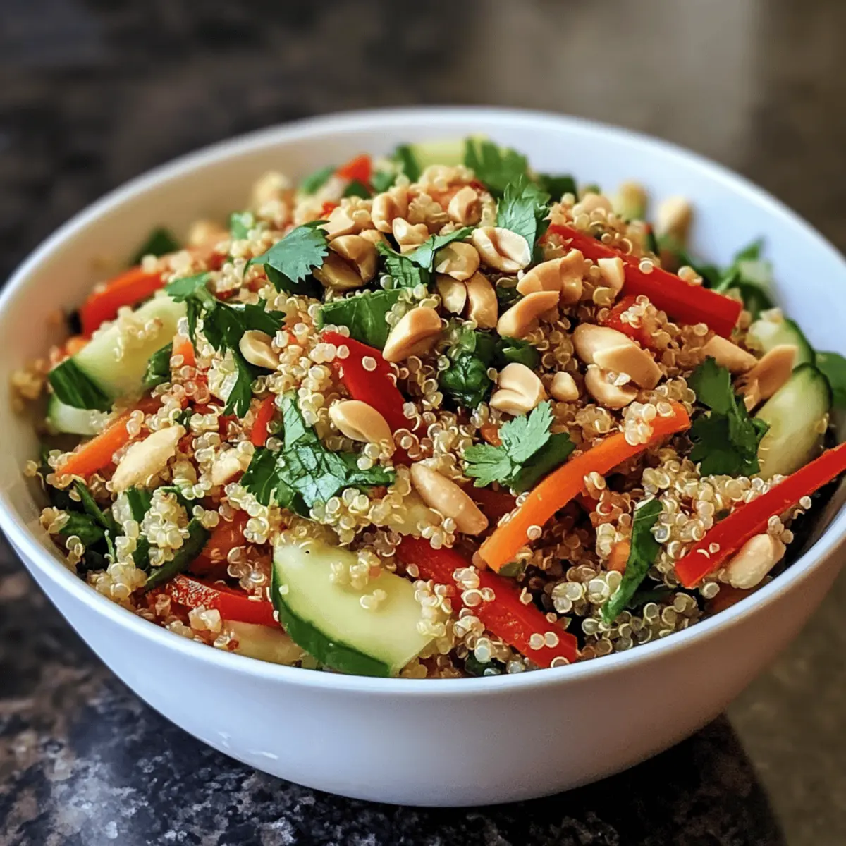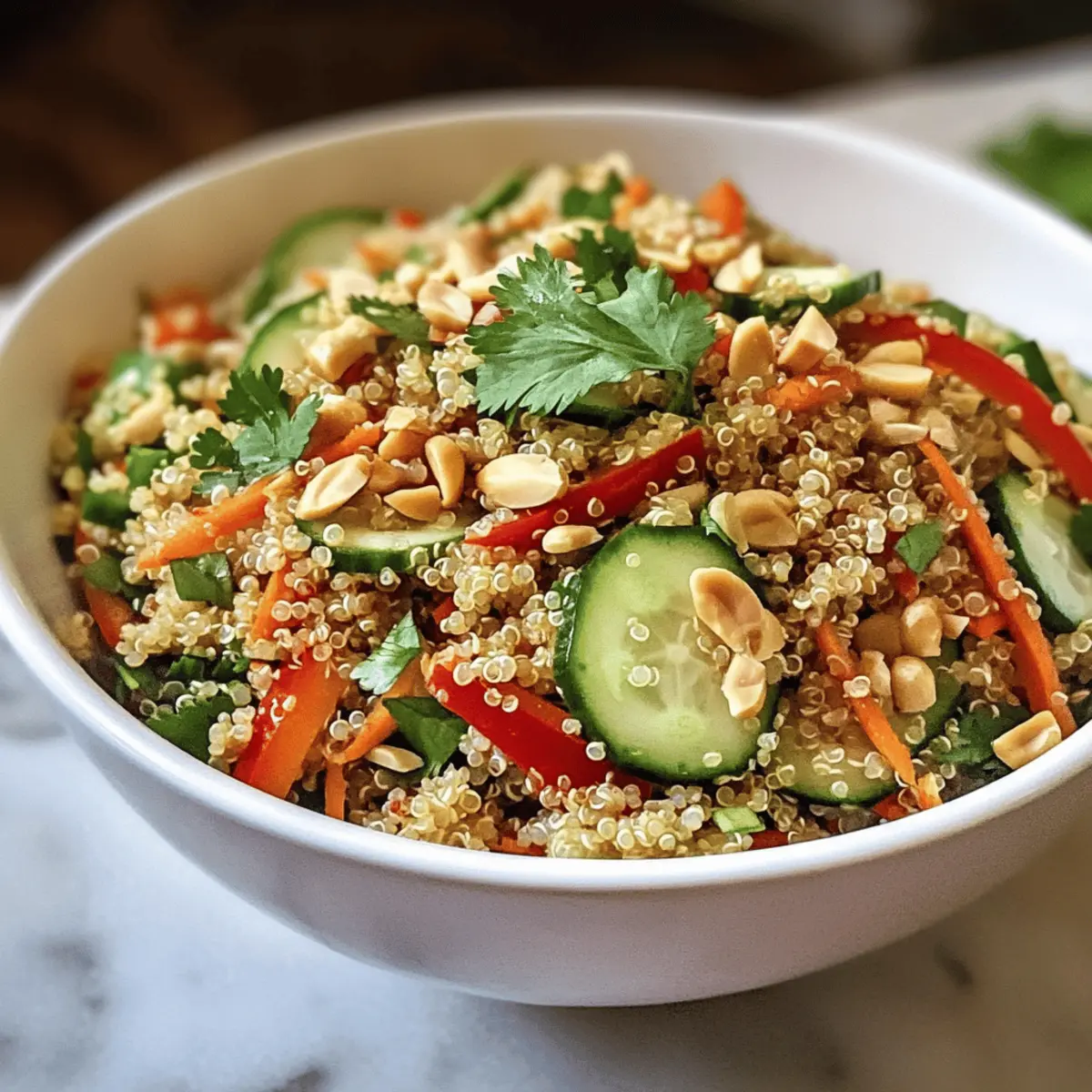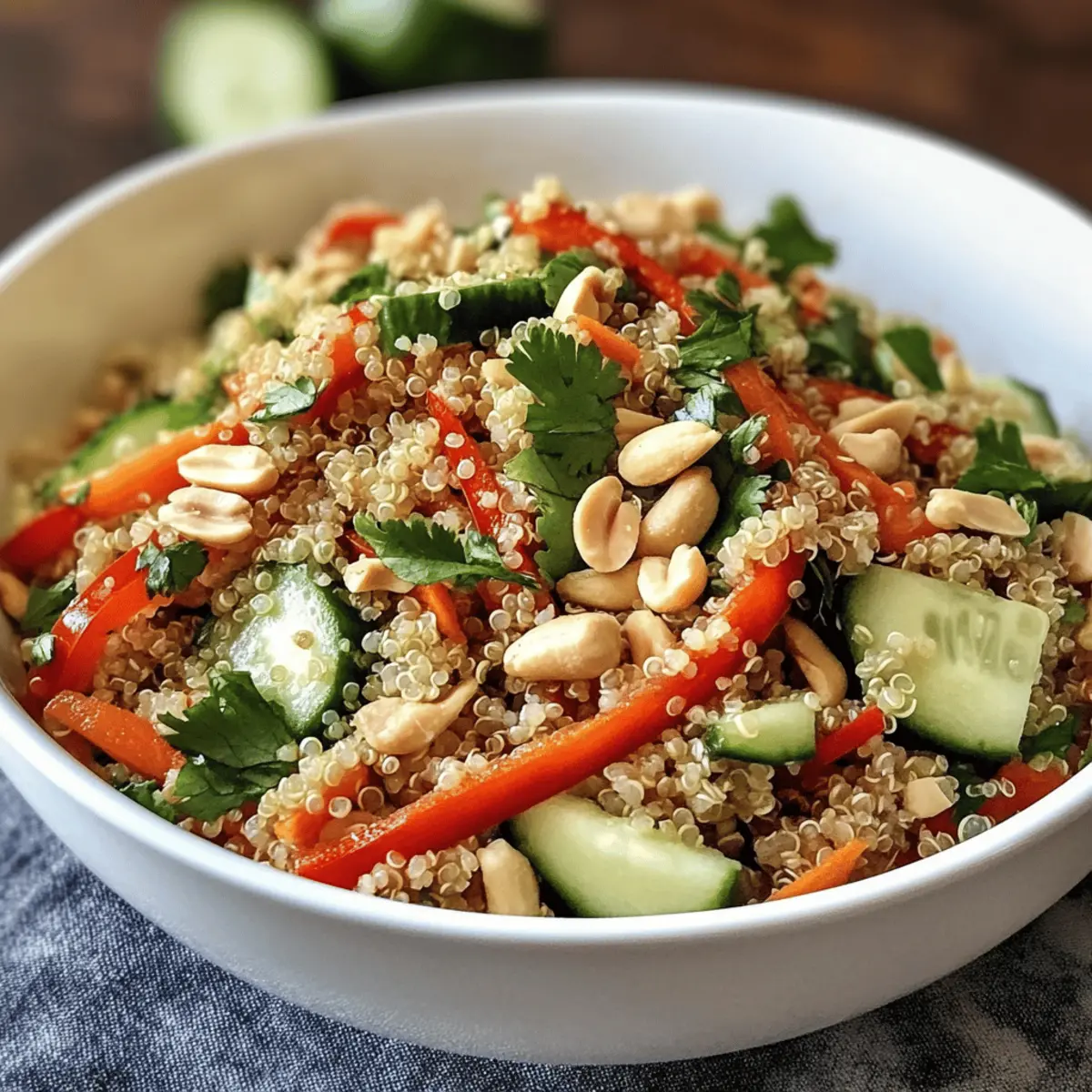 Jump to Recipe Print RecipeEn portant un saladier aux couleurs éclatantes sur la table, c’est comme si j’apportais un peu de soleil. La Salade de Quinoa Croquante Thaïlandaise est une fête pour les yeux et le palais ! En seulement 30 minutes, vous pourrez savourer un mélange délicieux de quinoa aux notes de noisette et de légumes croquants. Ce plat est un véritable trésor de santé : il est à la fois léger et rassasiant, parfait pour ceux qui aiment préparer des repas rapides sans compromettre le goût. Que ce soit pour un déjeuner sur le pouce ou une délicieuse entrée entre amis, cette salade élève n’importe quel repas au rang des incontournables. Alors, prêt à découvrir cette recette qui va ravir vos papilles ? Pourquoi cette salade est-elle incontournable ? Éclatante et colorée : Chaque bouchée de la Salade de Quinoa Croquante Thaïlandaise évoque un mélange vibrant de saveurs, grâce à ses légumes frais et son quinoa noisette. Simplicité d’exécution : En seulement 30 minutes, vous pouvez préparer ce plat, parfait pour les journées chargées ou les dîners improvisés. Options variées : Ajoutez du poulet ou du tofu pour un supplément de protéines, ou modifiez les légumes selon vos préférences. Santé et légèreté : Avec environ 220 calories par portion, cette salade est un modèle de nutrition, parfaite pour maintenir votre énergie tout au long de la journée. Applaudissements garantis : Que ce soit pour un déjeuner en solo ou un repas convivial, cette salade fera sensation à chaque fois ! Essayez-la et n’oubliez pas de consulter d’autres recettes comme la Salade Thailandais Recette pour plus d’inspiration saine. Ingrédients de la Salade de Quinoa Croquante Thaïlandaise • Préparez-vous à découvrir les ingrédients simples qui rendent cette salade si délicieuse et pleine de vie ! Pour le Quinoa Quinoa – Un ingrédient de base riche en protéines et en fibres. Pensez à bien le rincer pour enlever l’amertume de la saponine. Eau – Essentielle pour cuire votre quinoa. Utilisez 2 tasses d’eau pour chaque tasse de quinoa. Pour les Légumes Poivron Rouge – Apporte douceur, couleur et croquant. Remplacez-le par un poivron jaune ou orange pour une saveur différente. Concombre – Offre hydratation et fraîcheur. Choisissez un concombre anglais pour un croquant supplémentaire. Carottes Râpées – Introduit douceur et texture. Vous pouvez aussi utiliser de la courgette râpée si vous préférez. Oignons Verts – Ajoute une saveur d’oignon douce. Les poireaux peuvent également être une alternative délicieuse. Coriandre Fraîche – Renforce la fraîcheur de la salade. Peut être remplacée par du persil pour un goût différent. Pour la Garniture Cacahuètes Hachées – Ajoute des graisses saines et du croquant. Remplacez-les par des graines de tournesol pour une version sans noix. Graines de Sésame – Apporte une saveur de noisette et une belle touche visuelle. Peut être omis si vous n’en avez pas. Pour l’Assaisonnement Sauce Soja – Apporte umami et salé. Utilisez de la sauce soja sans gluten pour une version sans gluten. Jus de Citron Vert – Donne de l’acidité et de la luminosité. Le vinaigre de riz peut également apporter une acidité similaire. Miel – Ajoute une touche de douceur. L’agneau peut être utilisé à la place pour une version vegan. Huile de Sésame – Impartit une richesse et un arôme. L’huile d’olive peut être utilisée en remplacement si nécessaire. Gingembre Râpé – Offre chaleur et profondeur. Du gingembre en poudre peut faire l’affaire, mais ajustez la quantité. Ail Émincé – Renforce la complexité des saveurs. Les échalotes peuvent être une alternative pour un goût plus doux. Sel et Poivre – Assaisonnement essentiel. Ajustez selon votre goût selon vos préférences. Cette Salade de Quinoa Croquante Thaïlandaise vous attend, pleine de couleurs et de saveurs, toute prête à faire vibrer vos papilles ! Instructions étape par étape pour la Salade de Quinoa Croquante Thaïlandaise Step 1: Cuire le quinoa Dans une casserole moyenne, combinez le quinoa rincé avec 2 tasses d’eau. Portez à ébullition à feu moyen, puis couvrez et réduisez le feu pour laisser mijoter pendant 15 minutes. Une fois le liquide absorbé, vérifiez que le quinoa est tendre et éveillez-le avec une fourchette. Laissez-le refroidir. Step 2: Préparer les légumes Pendant que le quinoa refroidit, prenez un couteau et une planche à découper pour hacher le poivron rouge, le concombre, et les oignons verts. Râpez les carottes pour ajouter de la douceur et de la texture. Hachez également la coriandre fraîche. Assurez-vous que tous les légumes sont uniformément découpés pour une belle présentation dans la Salade de Quinoa Croquante Thaïlandaise. Step 3: Préparer la vinaigrette Dans un petit bol, mélangez la sauce soja, le jus de citron vert, le miel, l’huile de sésame, le gingembre râpé, et l’ail émincé. Fouettez jusqu’à ce que le mélange soit bien homogène. Cette vinaigrette apportera une profondeur de saveur à votre salade. Goûtez et ajustez le sel et le poivre selon votre préférence. Step 4: Combiner les ingrédients Dans un grand saladier, versez le quinoa refroidi, puis ajoutez les légumes préparés, les cacahuètes hachées et les graines de sésame. Versez uniformément la vinaigrette sur le mélange. Avec des mouvements délicats, mélangez le tout pour enrober les ingrédients de la vinaigrette, veillant à ne pas écraser les légumes croquants. Step 5: Réfrigérer la salade Couvrez le saladier avec un film plastique et placez-le au réfrigérateur pendant au moins 30 minutes. Cela permettra aux saveurs de se marier et intensifiera définitivement le goût de votre Salade de Quinoa Croquante Thaïlandaise. Pensez à la sortir un peu avant de servir pour la ramener à température ambiante. Step 6: Servir Lorsque vous êtes prêt à d